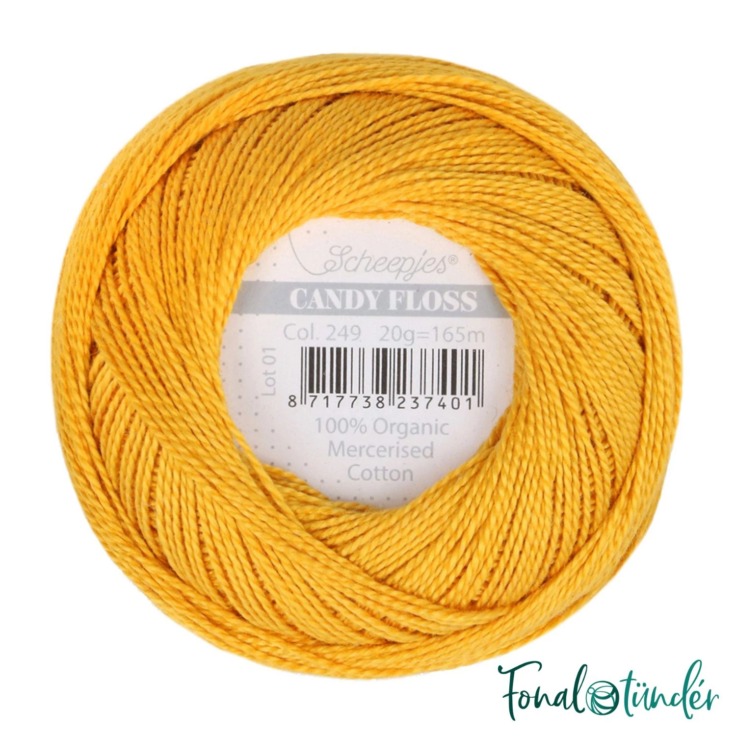 A Scheepjes Candy Floss 249 Saffron extra vékony, 100% organikus pamut hímzőfonal. A fonal árnyalata aranysárga, a narancssárga és citromsárga között, az indiai fűszer, a sáfrány intenzív színe. A Candy Floss erősen sodrott, finoman selymes felületű, mercerizált hímzőfonal, mellyel minden hímzés és öltés egyenletes és tökéletes lesz! No.10-es vastagságú hímzőfonal, melyet 0.75-1.25 mm-es tűvel akár meg is horgolhatsz csipkének, vagy mikroamiguruminak. Egy gombolyag 20 gramm, 165 méter hosszú.